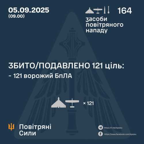 Повітряний наступ відбили авіаційні підрозділи, зенітно-ракетні війська, системи радіоелектронної боротьби та безпілотників, а також мобільні вогневі групи Сил оборони України. За попередніми повідомленнями, станом на 09:00 системи ППО перехопили або нейтралізували 121 ворожий безпілотник Shahed та різні типи безпілотників-імітаторів на півночі та сході країни.