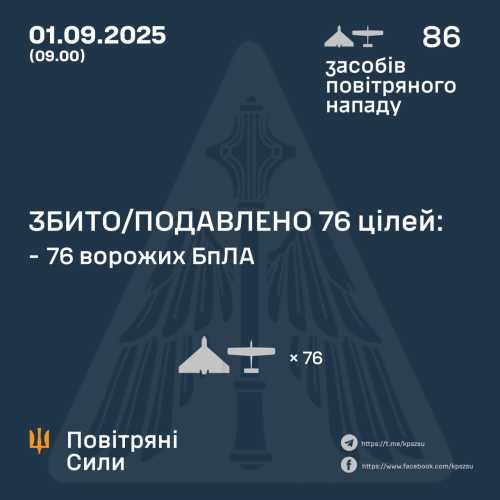 Повітряний натиск було відбито авіацією, зенітно-ракетними підрозділами, групами радіоелектронної боротьби та безпілотних систем, а також мобільними вогневими групами Збройних сил України. За попередніми повідомленнями, станом на 09:00 системи протиповітряної оборони перехопили або нейтралізували 76 ворожих безпілотників Shahed та різних типів імітаторів БПЛА у північних, південних, східних та центральних регіонах країни.