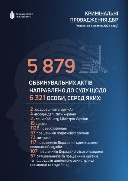 «Співробітники продовжують інтенсивну боротьбу з корупційними діяннями та притягують до відповідальності урядовців і правоохоронців, котрі зловживають службовим становищем або вчиняють інші посадові злочини. За січень-вересень 2025 року співробітники ДБР завершили досудове слідство і передали до суду 5 тис. 879 обвинувальних актів щодо 6 тис. 321 особи», – зазначено в повідомленні.