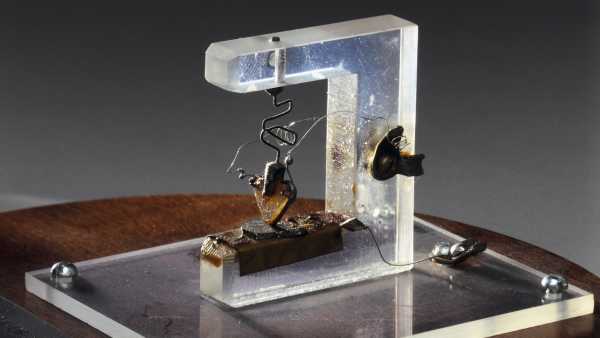 Репліка першого робочого транзистора. У конструкції використовувалися два тонкі шматочки золота, спіральна пружина та пластина германію. Транзистори пройшли довгий шлях розвитку з того часу, а деякі з найменших мають товщину лише атом. (Зображення: Бібліотека зображень Science & Society через Getty Images) Короткі факти