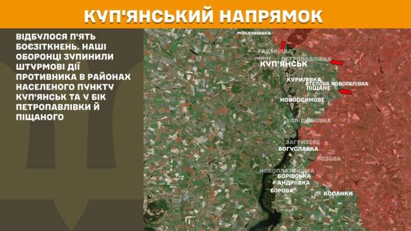 На Куп'янському напрямку сталося п'ять зіткнень. Війська оборони припинили російські наступальні операції в районі Куп'янська та в напрямку Петропавлівки та Піщаного.
