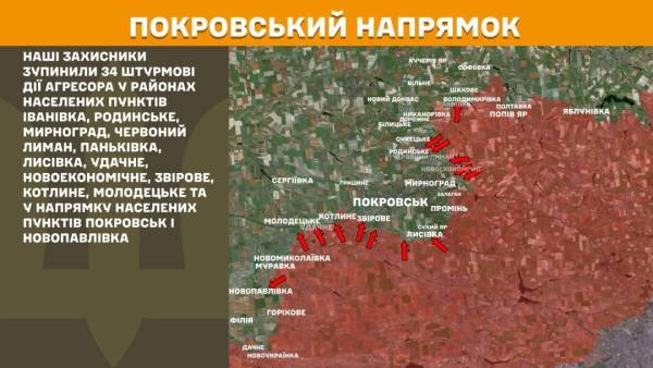 На Покровському напрямку наші оборонці зупинили 34 штурмові дії агресора в районах населених пунктів Іванівка, Родинське, Мирноград, Червоний Лиман, Паньківка, Лисівка, Удачне, Новоекономічне, Звірове, Котлине, Молодецьке та у напрямку населених пунктів Покровськ і Новопавлівка.