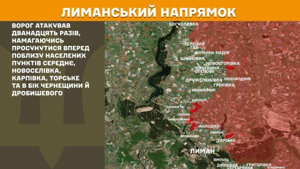 На Лиманському напрямку ворог атакував 12 разів, намагаючись просунутися вперед поблизу населених пунктів Середнє, Новоселівка, Карпівка, Торське та в бік Чернещини й Дробишевого.