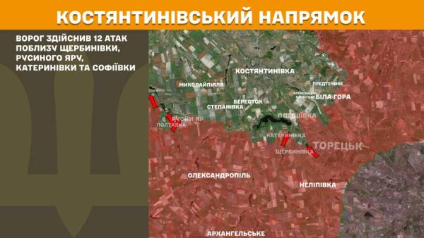 На Костянтинівському напрямку ворог здійснив 12 атак поблизу Щербинівки, Русиного Яру, Катеринівки та Софіївки.