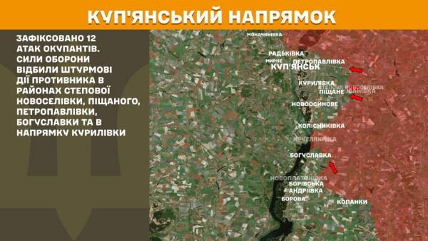 На Куп’янському напрямку протягом доби зафіксовано 12 ворожих спроб наступу. Українські воїни відбили штурмові дії росіян поблизу Степової Новоселівки, Піщаного, Петропавлівки, Богуславки та в напрямку Курилівки.