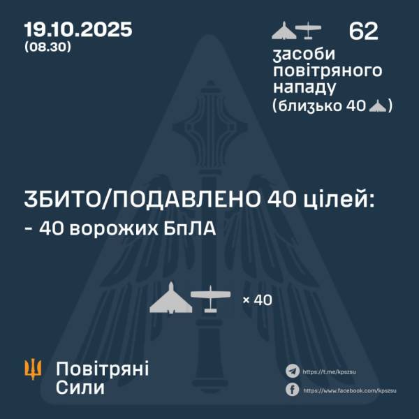 ППО знешкодила 40 із 62 ворожих безпілотників, є влучання на сімох локаціях 19.10.2025 08:39 Укрінформ Сили протиповітряної оборони нейтралізували 40 з 62 російських безпілотних апаратів, відмічені попадання на семи ділянках. Як повідомляє Укрінформ, про це Повітряні Сили Збройних Сил України оголошують у Телеграм-каналі. Відповідно до інформації, з 19:00 суботи, 18 жовтня, росіяни здійснили напад 62 ударними БПЛА типу Shahed, "Гербера" і безпілотниками інших видів з напрямків: Міллєрово, Курськ, Орел, Шаталово, Приморсько-Ахтарськ. Приблизно 40 із них – дрони типу Shahed. Повітряну атаку відбивали авіація, зенітні ракетні війська, підрозділи радіоелектронної боротьби та безпілотних систем, мобільні вогневі групи Сил оборони України. За попередніми відомостями, станом на 08:30 неділі, 19 жовтня, ППО збила/придушила 40 дронів на півночі та сході держави.