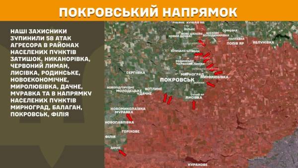 На Покровському напрямку українські оборонці зупинили 58 ворожих атак в районах населених пунктів Затишок, Никанорівка, Червоний Лиман, Лисівка, Родинське, Новоекономічне, Миролюбівка, Дачне, Муравка та в напрямку населених пунктів Мирноград, Балаган, Покровськ, Філія.