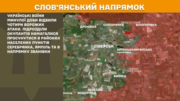На Слов’янському напрямку українські бійці відбили чотири атаки російської армії. Підрозділи загарбників намагалися просунутися в районах населених пунктів Серебрянка, Ямпіль та в напрямку Званівки.