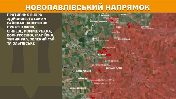 На Новопавлівському напрямку ворог здійснив 21 обстріл у районах Філі, Січневого, Комишувахи, Воскресенки, Маліївки, Темирівки, Зеленого Гаю та Ольгівського.