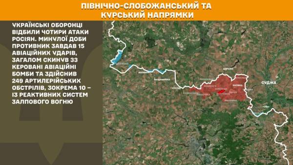 На Північно-Слобожанському та Курському напрямках Війська оборони відбили чотири ворожі атаки. Росіяни здійснили 15 авіаударів, застосувавши 33 керовані боєприпаси, та випустили 249 артилерійських обстрілів, зокрема 10 із РСЗВ.