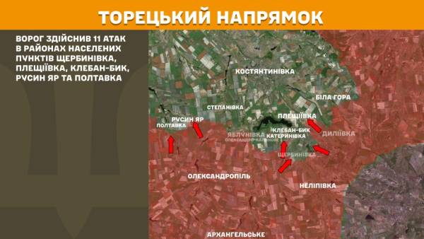 На Торецькому напрямку ворог здійснив 11 обстрілів в районі Щербинівки, Плещіївки, Клебань-Бика, Русиного Яру та Полтавки.